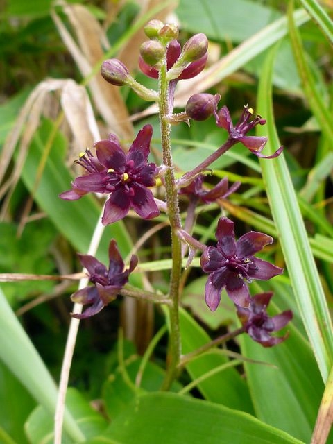 花は黄色で花被片と花柱に紫色の斑点が多数ある。