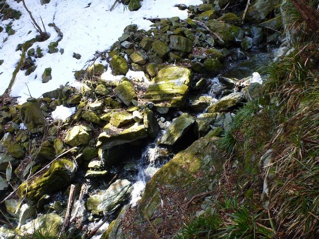 小さな谷を二つ三つ渡渉したらボルトの飛び出た分岐にたどり着く。