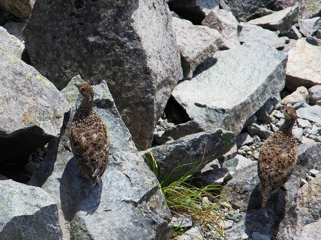 後を振り返ると、屏風ノ頭(左)と屏風ノ耳(三等三角点 [屏風岩] 2565.4m)の大きな岩塊が聳える。