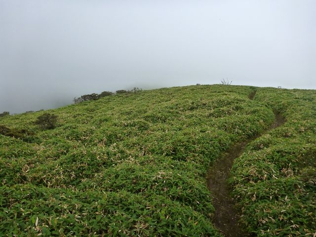 明神岳の「とんがり山」を左手に仰ぎながらのんびり歩く。