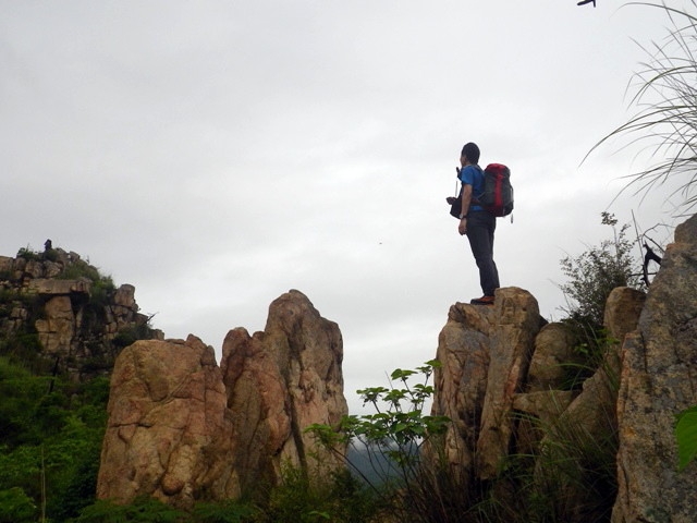 鞍部の岩から「えぼし岩」を振り返ってみる。低い場所からなので岩はテッペンしか見えてない。団体さんの一人が岩の手前まで登っている。