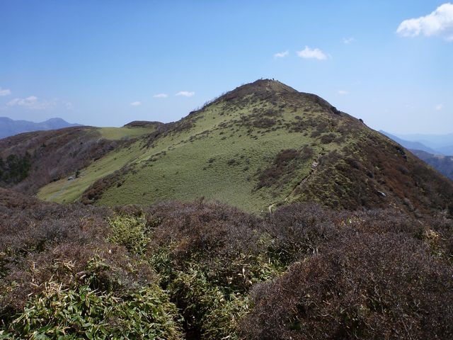 ユルギ岩からの北西方向の工石山山頂(右端)。西には、登岐山や笹ヶ峰・ちち山が見える。(2枚合成)。ランチタイムの前に、山頂までピストンしておこう。