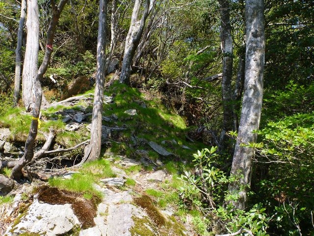 シャクナゲの咲く岩上から北東方向にはカガマシ山のなだらかな稜線。