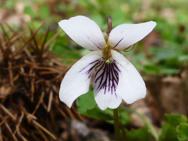 シコクスミレ(四国菫)は、スミレ科スミレ属の多年草でスミレサイシンの仲間。本州(関東以西)・四国・九州の太平洋側のブナなど落葉樹林に多い。フモトスミレより一回り大きく唇弁と側弁に紫色の筋がある。ハート型の鋸葉の先が尖る。花期は、4月~5月。