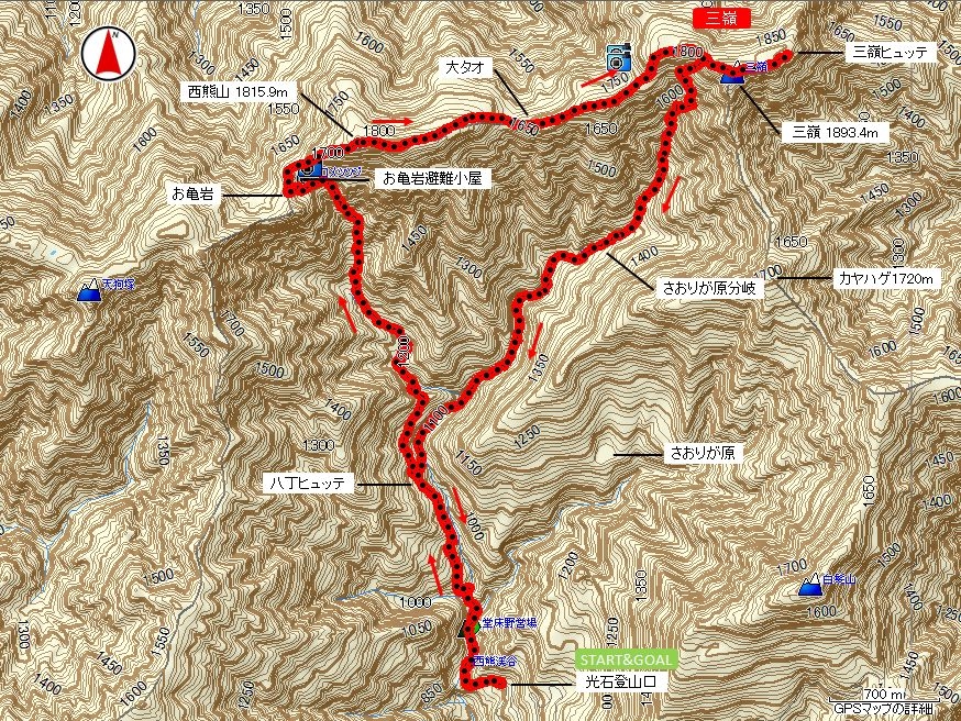 光石登山口 9:04(33分)→ 八丁 9:37/9:39(21分)→ 渡渉点 10:00(1時間3分)→ お亀岩避難小屋 11:03/11:08(3分) → お亀岩 11:11/11:14(27分)→ 西熊山 11:41/11:44(16分)→ 大タオ 12:00(40分)→ 三嶺 12:40/12:49(8分)→ 三嶺ヒュッテ 12:57(昼食)/13:33(13分)→ 三嶺 13:46/13:58(43分)→ さおりが原分岐 14:41(43分)→ 八丁 15:24(24分)→ 光石登山口 15:48