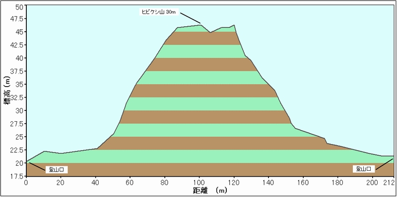 ヒビケシ山は、ピークを2つ持つ独立峰で、標高は30m。