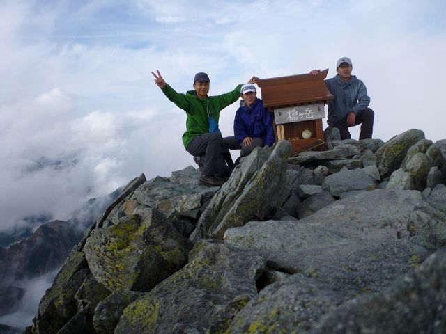5年ぶりの槍ヶ岳での記念撮影は、誰もいないのでセルフタイマー。