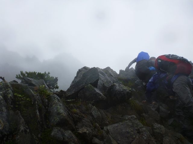 当初の計画は、「キタカマ」 の予定だったのだが、天候不良で止むを得ずコースを変更、雨の中、槍ヶ岳から大キレットを通って北穂高、更に涸沢岳へと高度感のある稜線を歩いてみた。