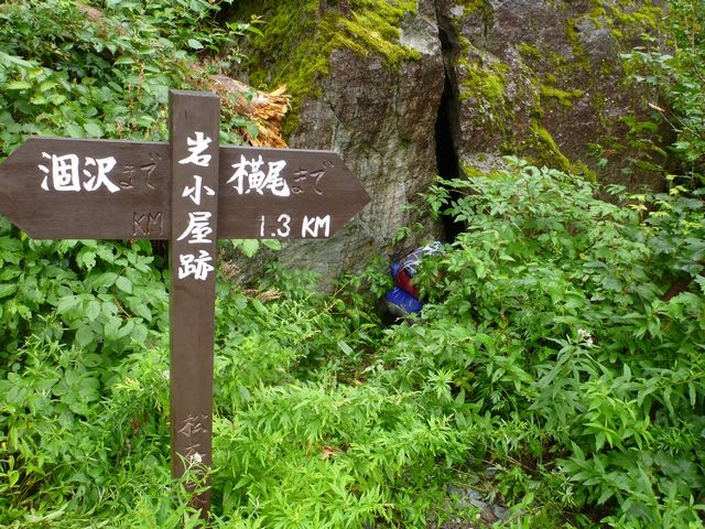 殺生分岐下の「坊主岩屋(播隆窟)」は、槍ヶ岳を開山した播隆上人がビバークに利用したといわれる。