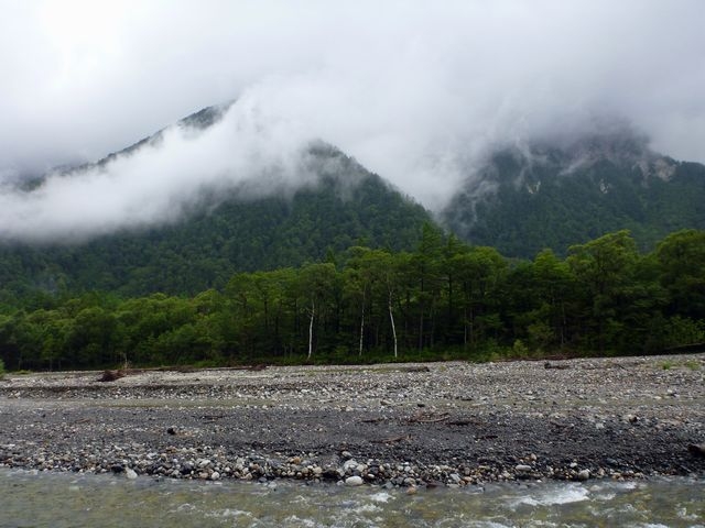 前穂高岳(明神岳)の裾野を巻くように蛇行する梓川沿いに北上する。