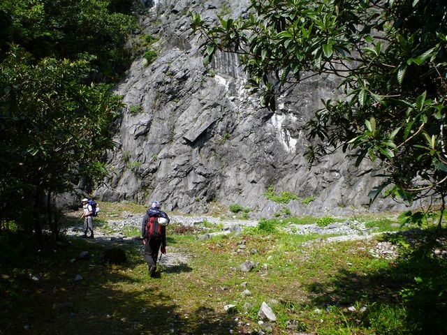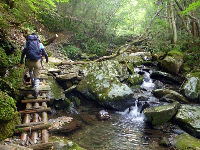 まずは前方の吊橋を別当谷の左岸へ渡って別当谷と柳谷川の間の尾根をつめ、南竜分岐を目指す。