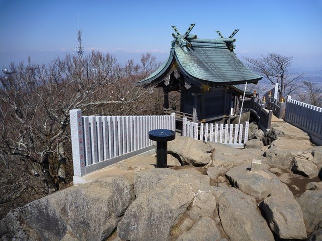 「日本百名山 筑波山 標高八七七m」と書かれた標柱と筑波女大神(つくばめのおおかみ)を祀る女体山御本殿のある筑波山山頂。