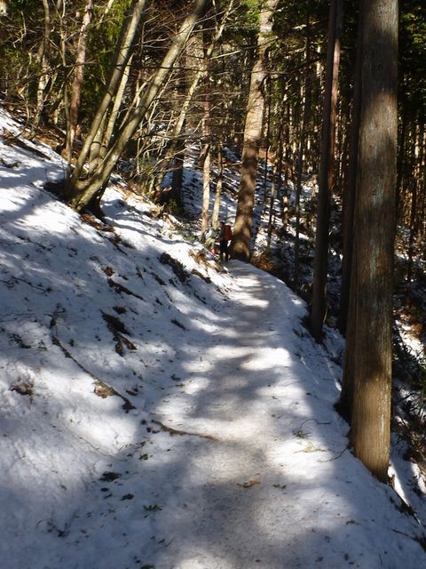堂所(ドウドコロ)付近から上の登山道は、よく踏み固められた日陰の雪が凍って歩きにくいことこの上ない。