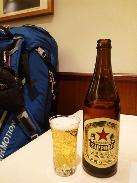 指定席に腰を落ち着けたら、ビールを飲みながら登山行程を確認。