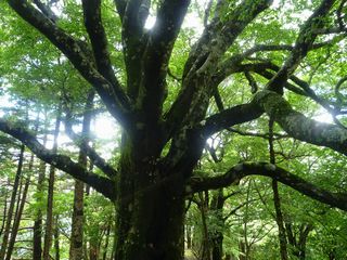 | 頭上にみごとな枝を伸ばすブナ(?)の大木。灰色っぽい樹皮には地衣類などがくっついて、模様ができる。 | |||||||